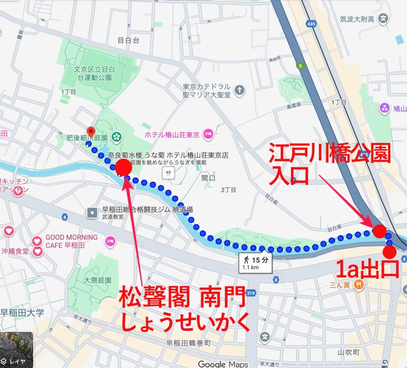 ▼東京メトロ有楽町線の江戸川橋駅1a出口からの道順(徒歩15分)